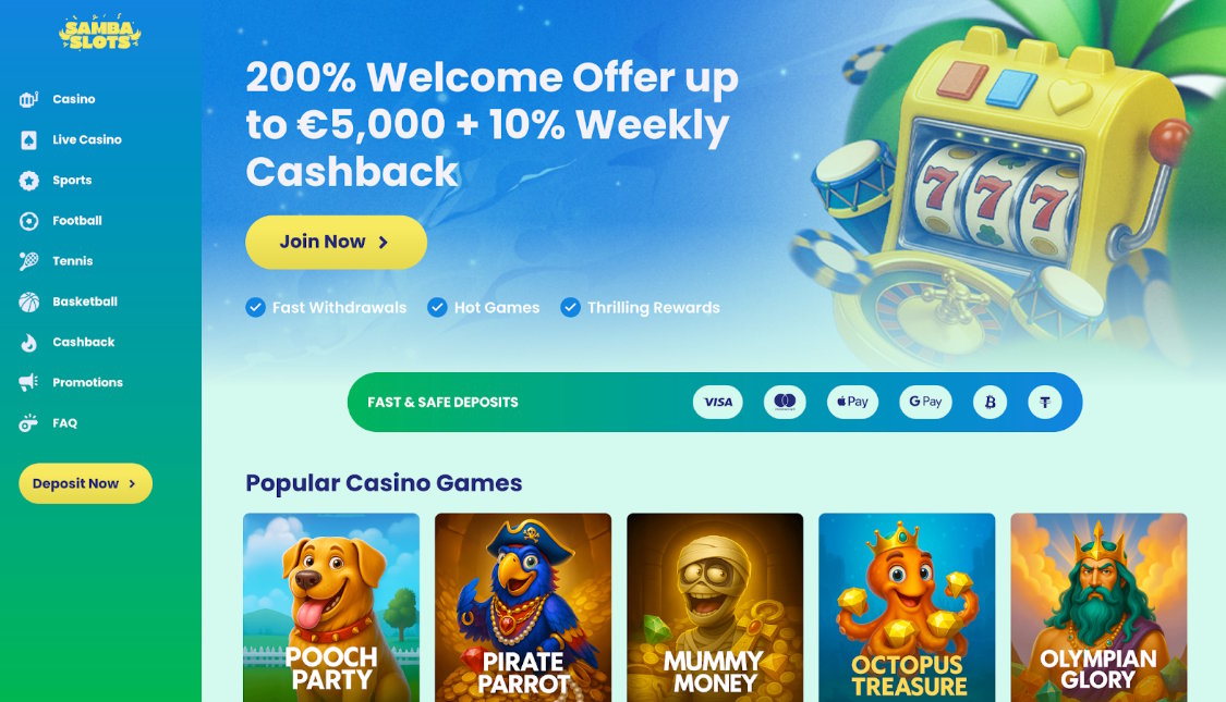 Samba Slots | 200% up to €5,000 + 50 FS | €20 | 30x | 3,000+ | Vibrant theme, fast crypto payouts | BTC, ETH, USDT, LTC, BNB, DOGE |