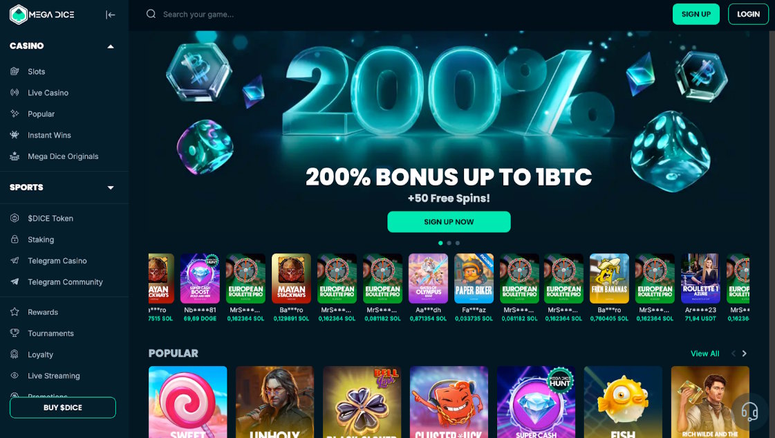 Mega Dice | 200% up to 1 BTC + Free Bet | €20 | 40x | 3,000+ | Sports + casino, Telegram play | BTC, ETH, LTC, USDT, DOGE, BNB, SOL |