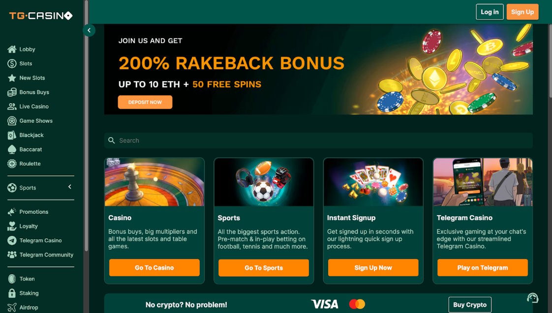 - TG.Casino - 200% bonus up to 10 ETH plus 50 free spins