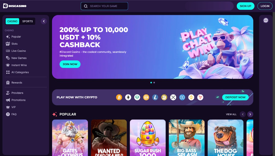 Discasino | 200% up to 10,000 USDT | €20 | 35x | 3,000+ | Discord integration, social play | BTC, ETH, USDT, DOGE, BNB, SOL, XRP |